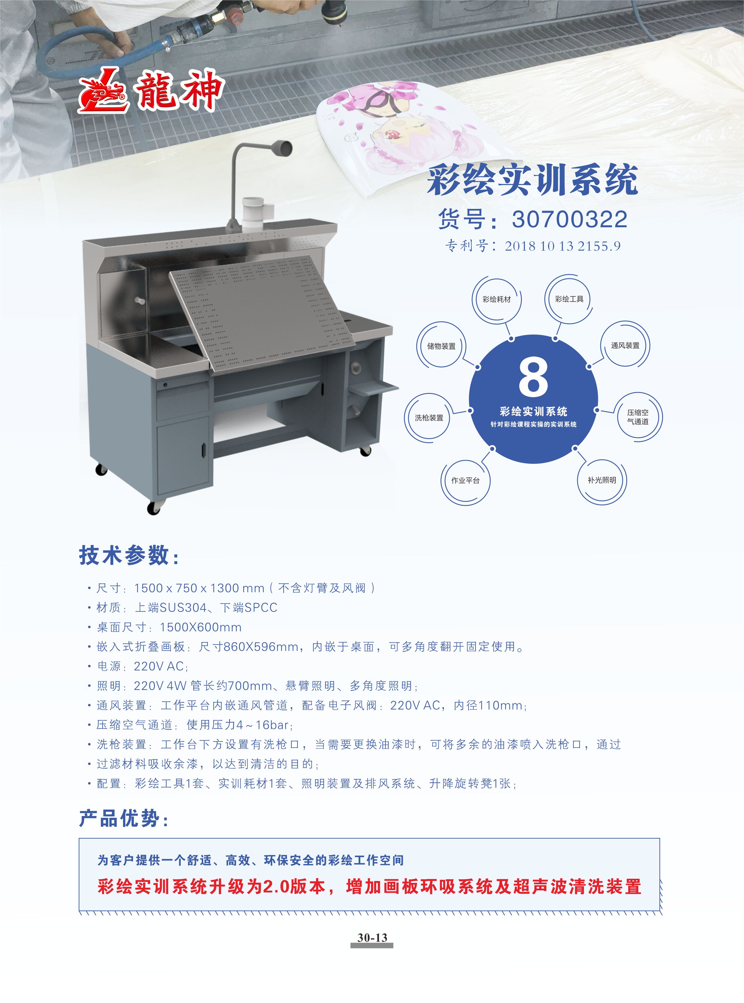 彩繪實訓系統(tǒng)是綜合了彩繪工具、彩繪耗材、儲物裝置、洗槍裝置、作業(yè)平臺、補光照明、壓縮空氣通道及通風裝置的,針對彩繪課程實操的實訓系統(tǒng)。為客戶提供一個舒適、高效、環(huán)保安全的彩繪工作空間。