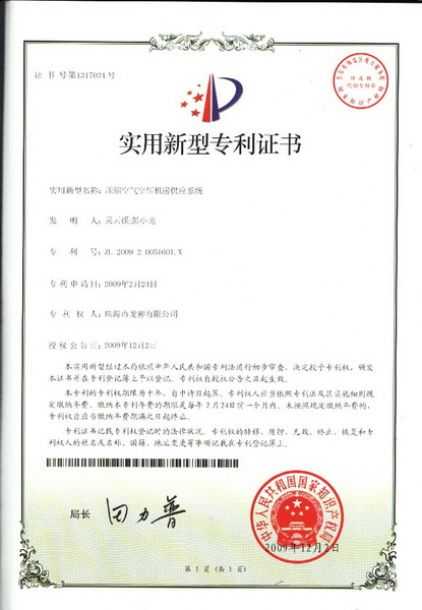 ![]() 壓縮空氣空壓機(jī)房供應(yīng)系統(tǒng)專利證書 | 除油劑導(dǎo)料器專利證書 |