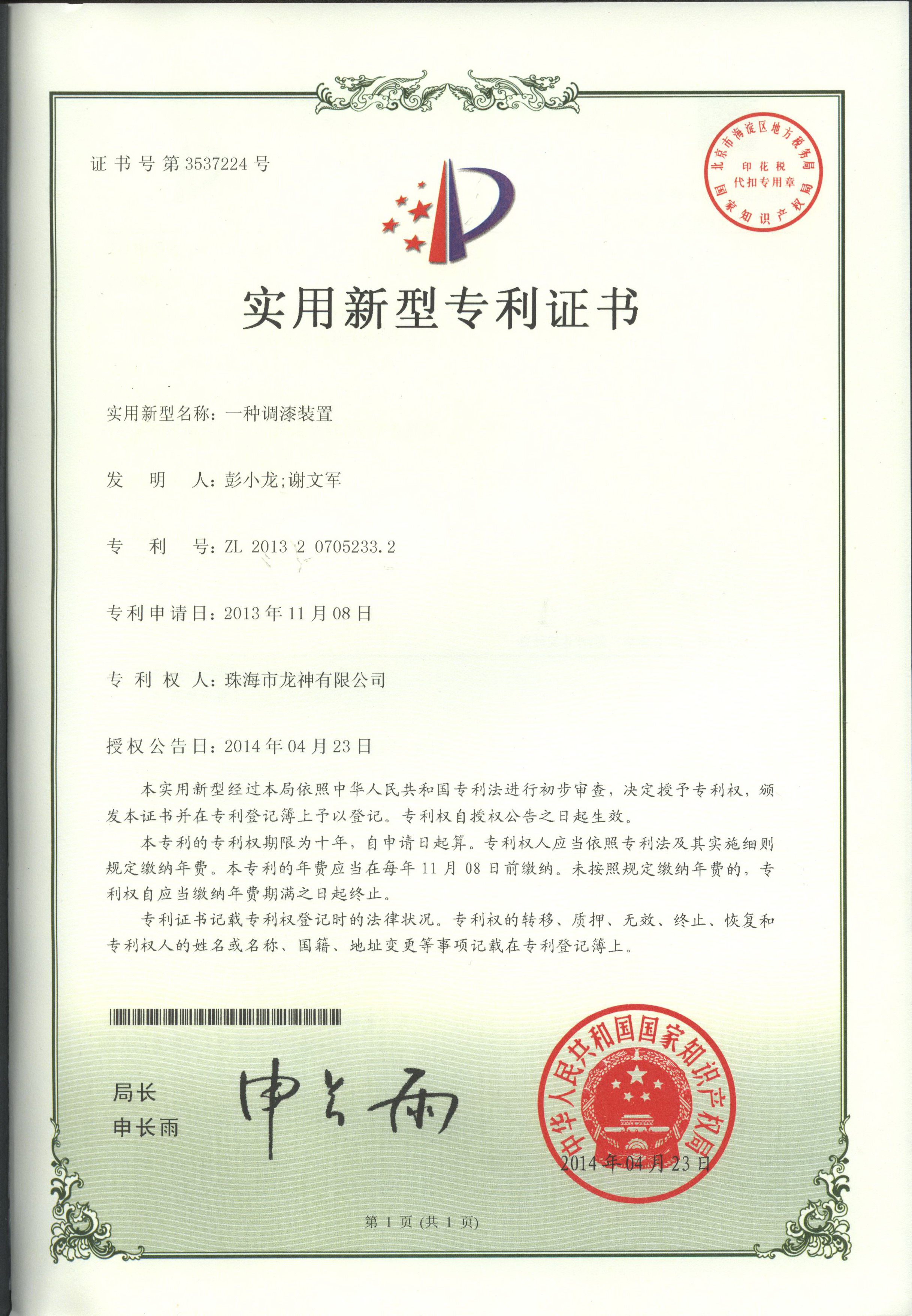 調(diào)漆裝置專利證書 | 噴漆柜專利證書 |